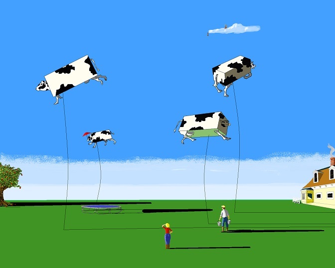 But Ludicrous Lily was a unique cubic cow, and her milk was eggnog, vanilla latte, gluehwein and pisco sour, among others. She was so lightheaded that she floated. The other cows were also cubic and floated too but they were not unique. Farmer Smith and his wife Penny would milk their cows by bouncing on a trampoline and reaching for their udders.