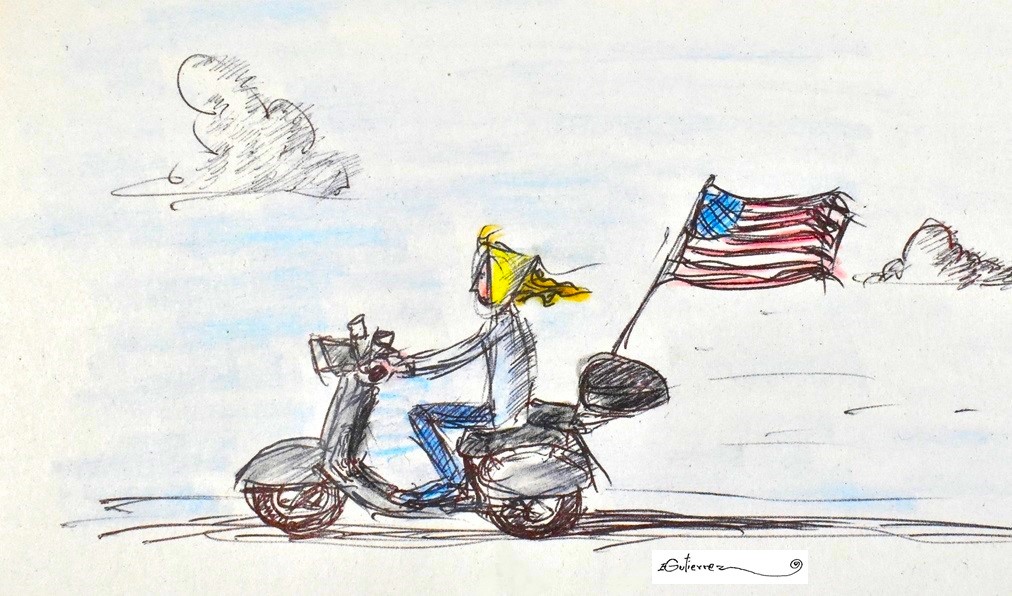 Girl on a scooter with a flag
