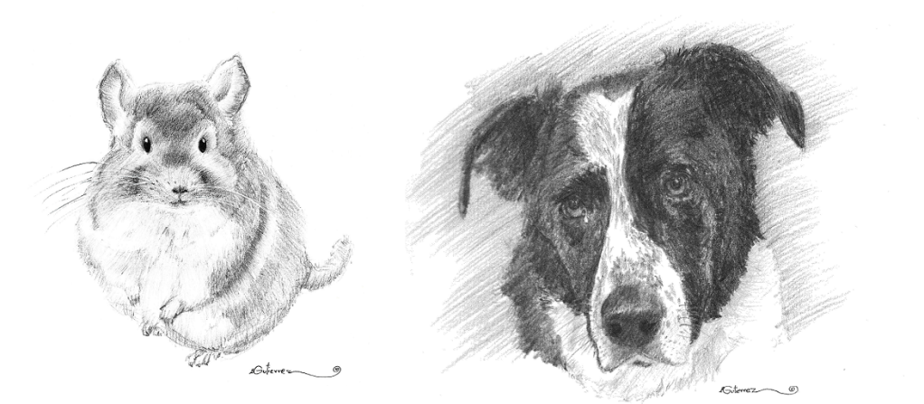 These are two samples of my pencil and charcoal drawing style that I use for portraits of pets. These portraits are custom-made and drawn by hand, a disappearing skill. They would look great framed and displayed on a wall, a desk etc. If you’re interested let me know and I’ll get down to work on the portrait of your loving pet. For more samples see my pet portraits page of past commissions